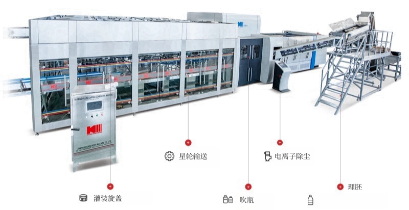 旋轉(zhuǎn)式吹灌旋一體機(jī)為旋轉(zhuǎn)式吹瓶機(jī)和灌裝機(jī)的優(yōu)化結(jié)合,此系列廣泛應(yīng)用于各種水類和飲料的生產(chǎn)。